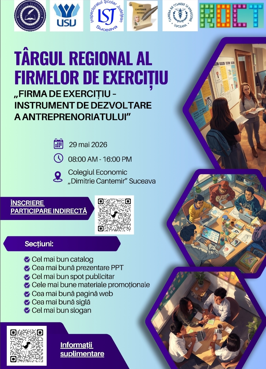 Ești gata să transformi teoria în practică? Colegiul Economic „Dimitrie Cantemir” Suceava invită toate firmele de exercițiu să participe la prima ediție a Târgului Firmelor de Exercițiu ”Firma de Exercițiu – instrument de dezvoltare a antreprenoriatului – evenimentul unde ideile de afaceri prind viață!