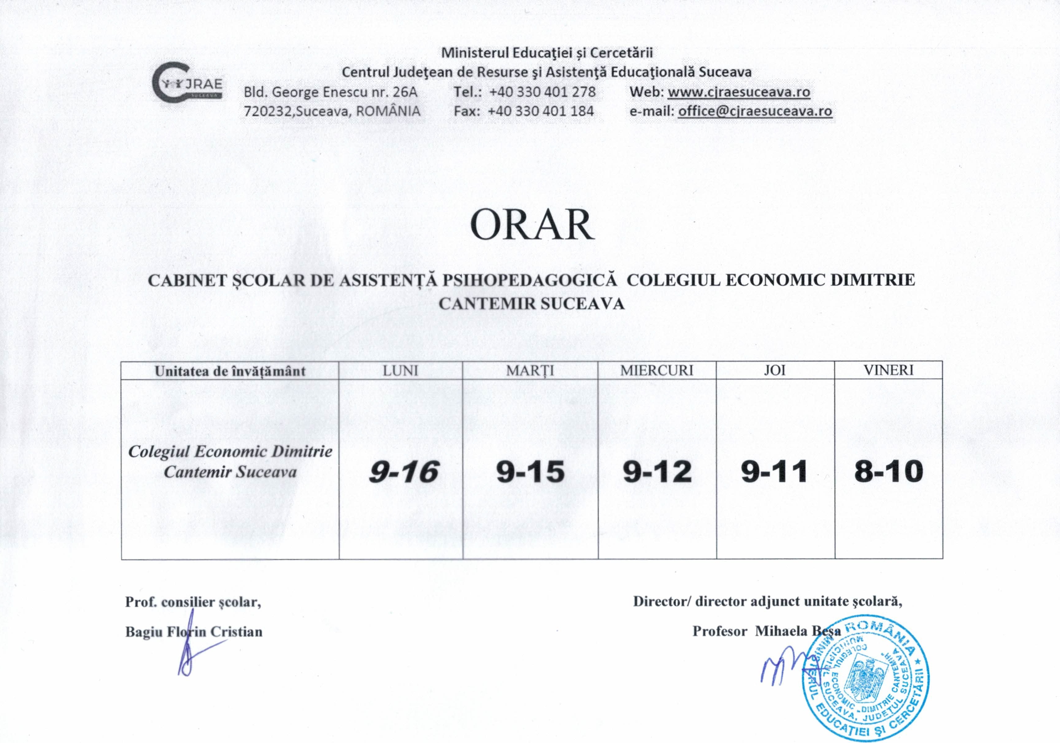 Mă numesc Florin Cristian Bagiu și sunt psihologul vostru şcolar. Cabinetul se află în incinta internatului, la etajul 1.