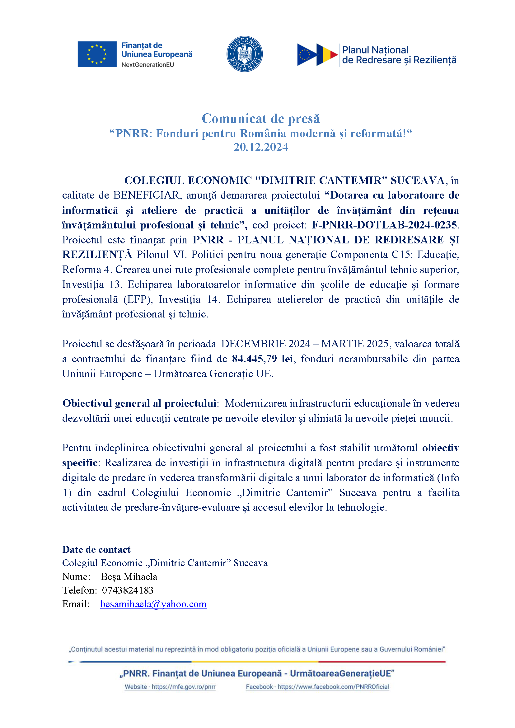 Viitorul este digital la Colegiul Economic ”Dimitrie Cantemir” Suceava: finalizarea a două proiecte majore cu finanțare prin PNRR
