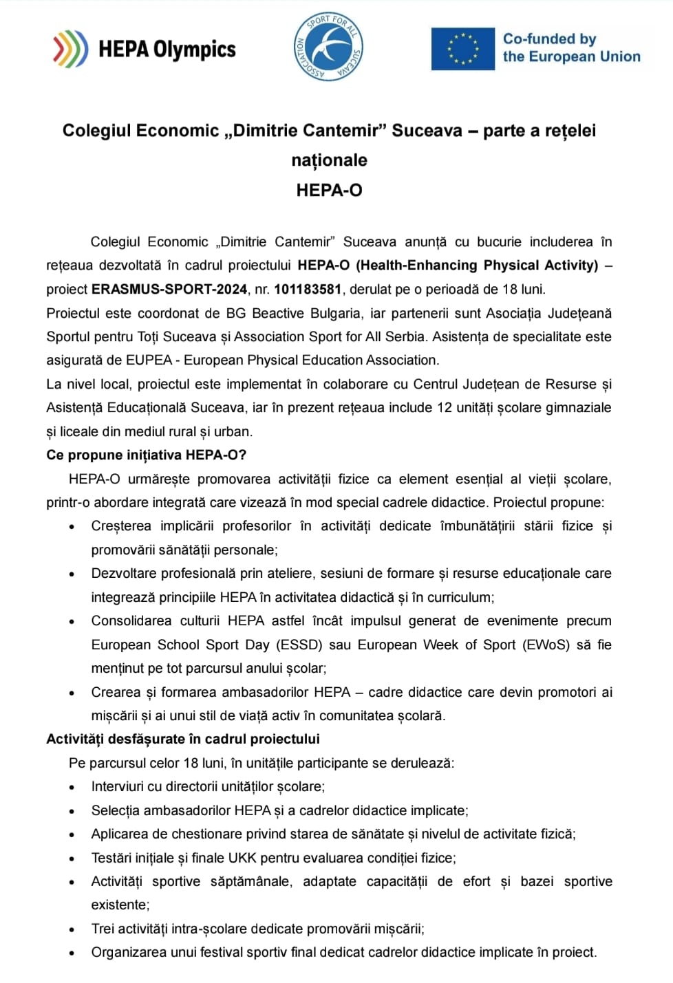 Colegiul Economic „Dimitrie Cantemir” face parte din proiectul european HEPA Olympics, o inițiativă dedicată implicării profesorilor din toate disciplinele în promovarea activității fizice pentru sănătate (Health-Enhancing Physical Activity).