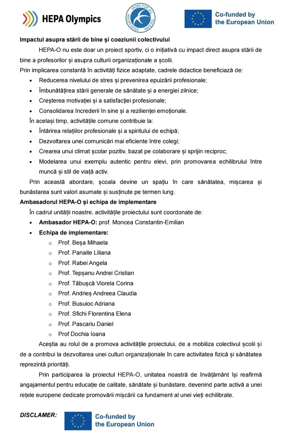 Proiectul susține formarea cadrelor didactice ca Ambasadori HEPA, dezvoltarea unei culturi instituționale orientate spre mișcare și integrarea activităților fizice în viața școlii, dincolo de ora de educație fizică.